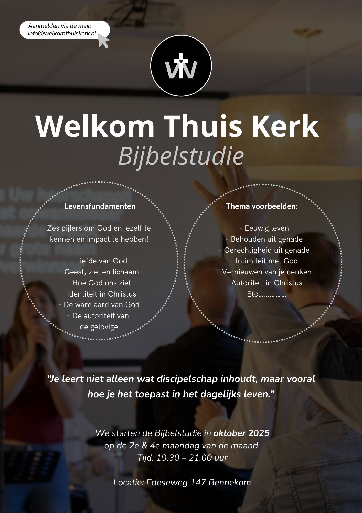 Vanaf maandag 13 oktober starten we bij Welkom Thuis Kerk met Bijbelstudie-avonden. Dit zal plaatsvinden iedere 2e en 4e maandag van de maand. De eerste avond is op 13 oktober.